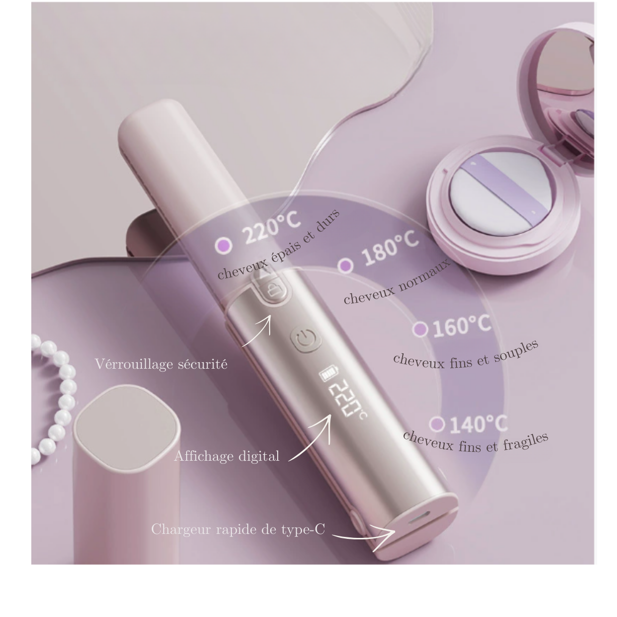 Contrôlez la température idéale selon votre type de cheveux : 140°C pour les plus fragiles, jusqu'à 220°C pour les épais et durs. Affichage digital clair, verrouillage sécurité enfant, batterie longue durée et charge rapide Type-C. Compact et élégant, il est prêt à sublimer vos cheveux n'importe où.